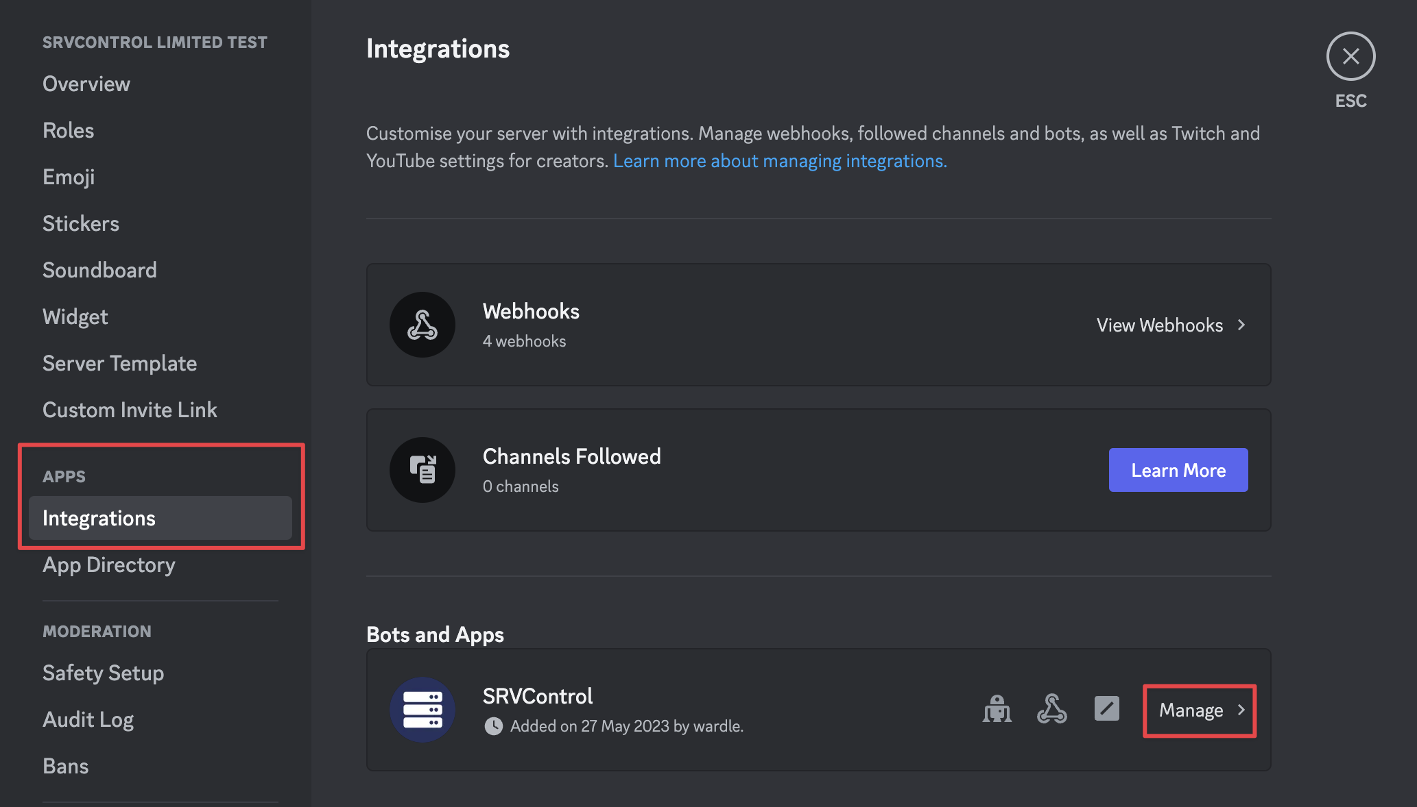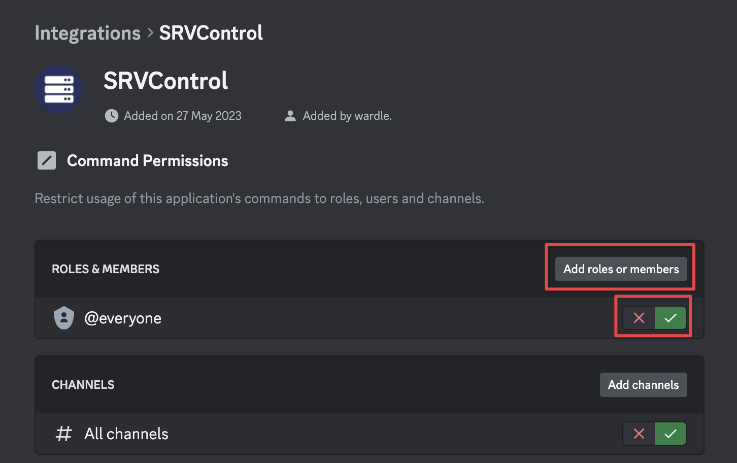 If your Discord server is public, you may want to restrict access to SRVControl commands.